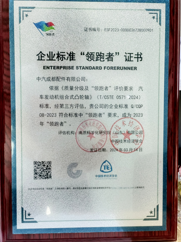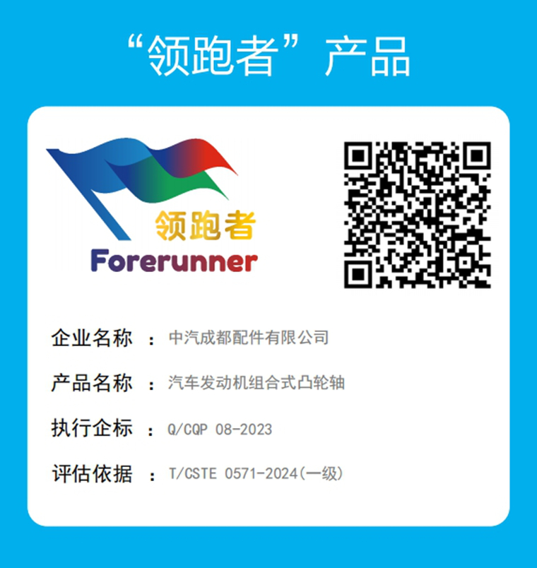 本网讯(刘国倩报道)近日,中汽成都配件有限公司(以下简称“中汽成配”)以企业标准 Q / CQP 08-2023符合全国《质量分级及“领跑者”评价要求 汽车发动机组合式凸轮轴》( T / CSTE 0571-2024)标准要求,经过中国技术经济协会权威评估机构的严格比对分析,最终被确认为符合“领跑者”标准的核心指标,成功跻身“领跑者”行列,再次成为行业标杆。